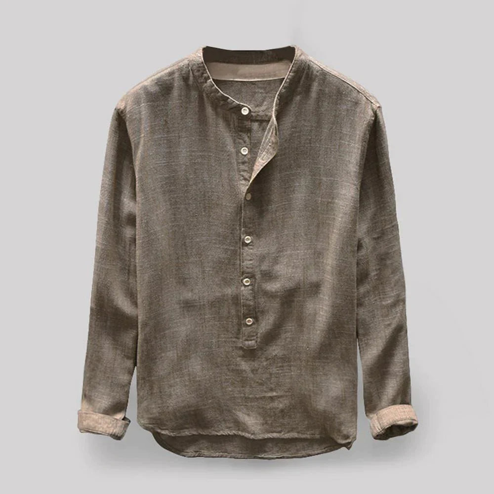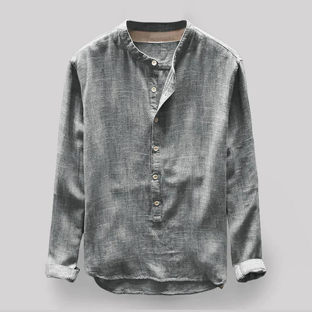 Casual-skjorter med henley-udskæring, mandarinkrave, enkel stil, ensfarvet, slim fit, lange ærmer (kan rulles op), knaplukning, afrundet søm, knapdetalje.